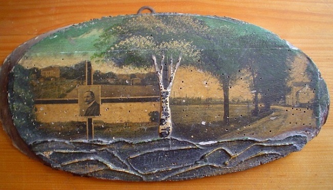 Vor ca. hundert Jahren hat jemand auf eine Birkenscheibe eine Ansichtskarte der Schrebergärten und eine der Polkwitzer Straße geklebt. Zwischen die beiden Karten bastelte er eine Birke und davor einen umgepflügten Ackerboden. Darunter schrieb er mit weißer Farbe Lüben. Nur das n ist nicht mehr sichtbar.