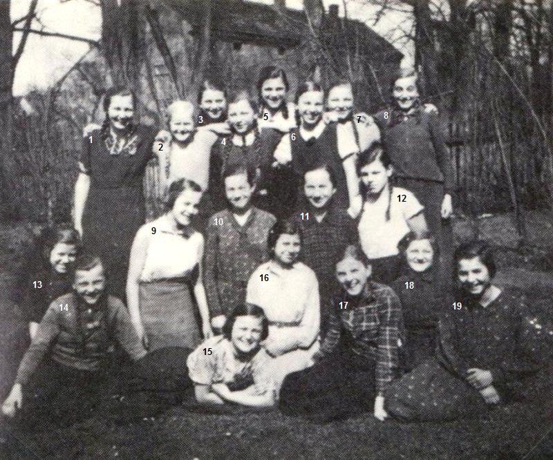 Elsbeth Schwarzhaupt geb. Bruschwitz (1921-2012) verdanken wir das Originalfoto und Gerda Jindra geb. Heidrich (1922-2015) die Zuordnung vieler Namen! Nicht alle Mädchen konnten sicher bestimmt werden, da mehrere Jahrgänge auf dem Foto sind. Korrekturen sind sehr willkommen, dafür kann ein größeres Bild übermittelt werden.