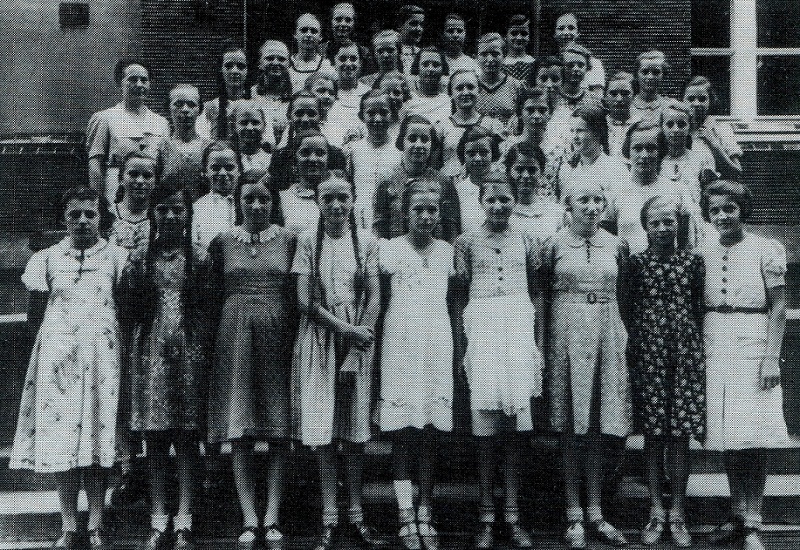 3. Reihe: Fräulein Else Zemke, Käthe Werner, Gerda Jakob, Magda Bieberstein (*1927), Vera Irrgang (*1926), dahinter Inge Albrecht (*1925), Ilse Kube (*1926), Hilde Ritter, Johanna Eigert, Ilse Ansahl (*1926), Ursel Schläger (*1926);