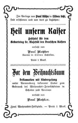 Daneben wird für zwei weitere Werke von Paul Matzker geworben: "Heil unserm Kaiser", einem Festspiel für den Geburtstag Sr. Majestät des Deutschen Kaisers,