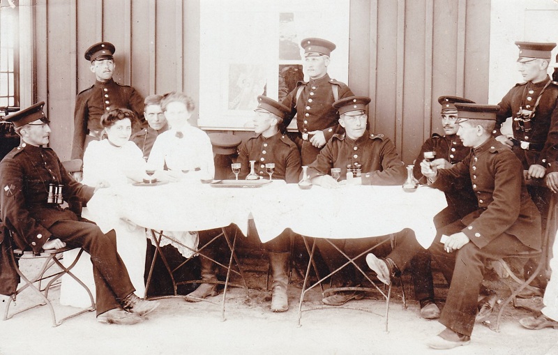 Lieber Janno! Umstehend eine Aufnahme von einer gemütlichen Rast in der Wosseckerbaude während einer fidelen Gebirgspartie! Vorigen Dienstag kamen wir nach 6tägiger Uebung vom Truppenübungsplatz Posen zurück; es war eine ziemlich böse Zeit, die wir dort verlebt haben, namentlich der letzte Tag war kolossal anstrengend. In nächster Zeit hoffe ich einige Tage Urlaub zu bekommen. Würde mich recht freuen, auch wieder einmal einige Zeilen von Ihnen zu bekommen.
