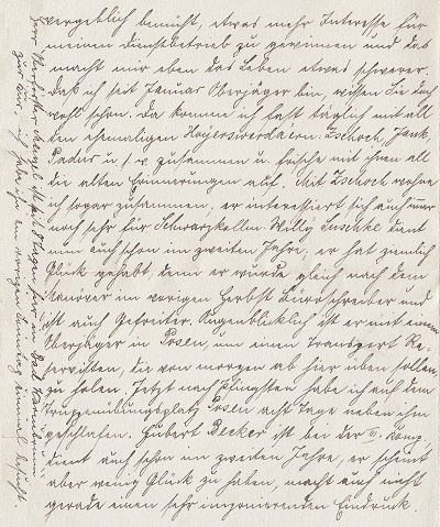Besten Dank für Ihre letzte Karte von der Gestellung. Seien Sie nur zufrieden, daß Sie so glücklich darum gekommen sind. Die ganze vorige Woche war ich im Gebirge auf Schneeschuhkommando; es war natürlich großartig. Dienstlich geht es mir jetzt ganz gut; der langweilige Rekrutendrill ist nun glücklich überstanden. Umstehend eine Aufnahme aus der Putzstunde. Bitte schreiben Sie mir auch wieder einmal u. grüßen Sie Familie Hoffmann u. die gesamte Petzerei von mir.