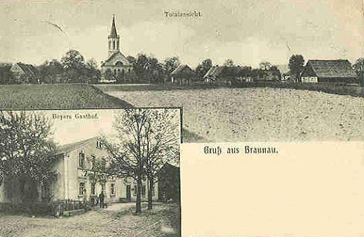 Wir fanden in Braunau eine Aufteilung der großen Güter; so gab es den Niederhof, Mittelhof und Oberhof, die einst einem Herrn Schwabe gehörten. Und neben der Kirche war noch eine Gruft der Familie Schwabe festzustellen. Anfangs war der Friedhof bei der Kirche und erst später wurde er etwas außerhalb des Dorfes angelegt.