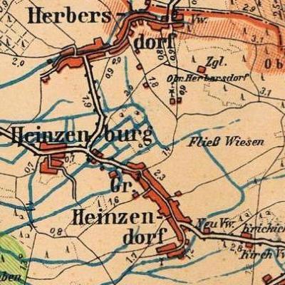 Paul Ilgner's Warenhandlung, Beier's Gasthaus, Evangelische Kirche Heinzenburg, Katholische Kirche Groß Heinzendorf