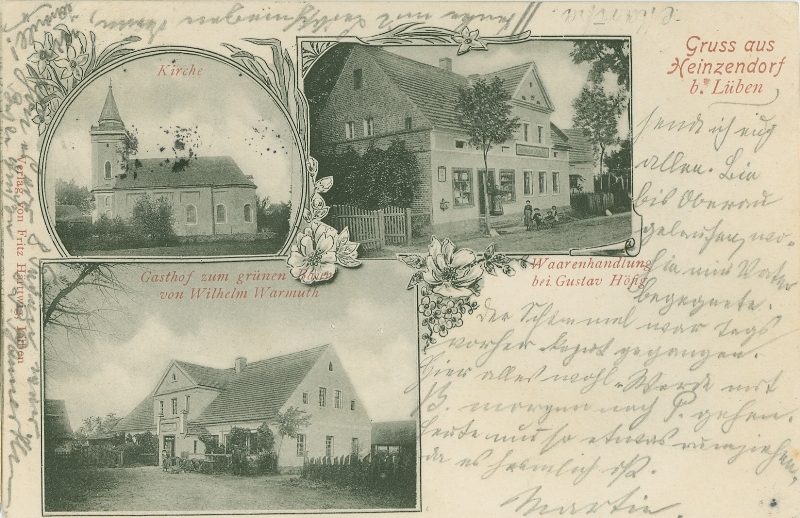 Groß Heinzendorf: Gustav Höfigs Warenhandlung, Gasthof zum grünen Baum von Wilhelm Lachmann, Katholische Kirche, Evangelische Kirche Heinzenburg |