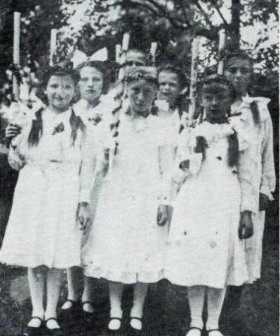 3. Reihe: Anna Scholz, mit der Kappe Anni Feige aus Würtsch-Helle, Sofie Somilio, Maria Glück, Hannchen Heppner, Lucie Stehr, Irmgard Wolf, Maria Pech, Martha Krischker, Hildegard Stehr, Hans Walter aus Würtsch-Helle, ganz rechts Hildegard Möller