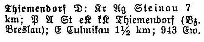 Dorf Kreis Steinau Regierungsbezirk Breslau 1030 Einwohner Gemeindevorsteher Karbe Postamt Thiemendorf Eisenbahnstation Güterladestelle Culmikau Amtsgericht Finanzamt Zollamt Steinau Landgericht Glogau Elektrizitätswerk Liegnitz evangelische und katholische Volksschule evangelische und katholische Kirche