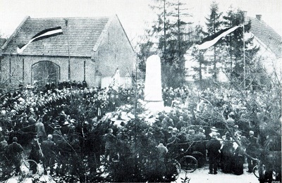An der Chaussee Lüben-Steinau nahe bei Thiemendorf standen einst diese beiden Steinkreuze. Man erzählte damals die Legende, sie seien zur Erinnerung an zwei feindliche Brüder aufgestellt worden, die wohl an dieser Stelle um ein Stück Land in Streit geraten sind und sich im Kampf jeder einen Arm verstümmmelt hätten, weshalb den Kreuzen auf einer Seite der Querbalken fehle. Der ehemals polnischsprachige Gedenkstein zwischen beiden Kreuzen wurde erst in der Nachkriegszeit aufgestellt. Wer weiß, was aus den Sühnekreuzen geworden ist?