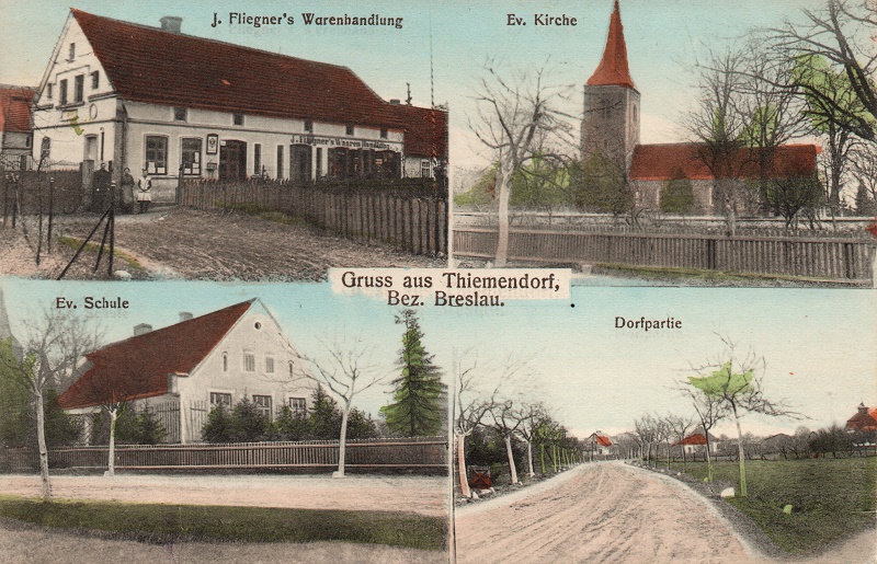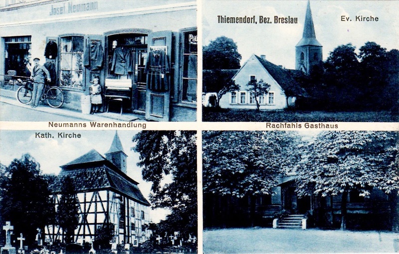 Thiemendorf 1912: Evangelische Kirche, Evangelisches Pfarrhaus (mit der handschriftlichen Anmerkung Meine Stube, vermutlich vom derzeitigen Pfarrer. Wer weiß seinen Namen?), Warenhandlung, Katholische Kirche