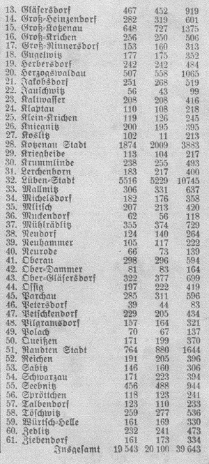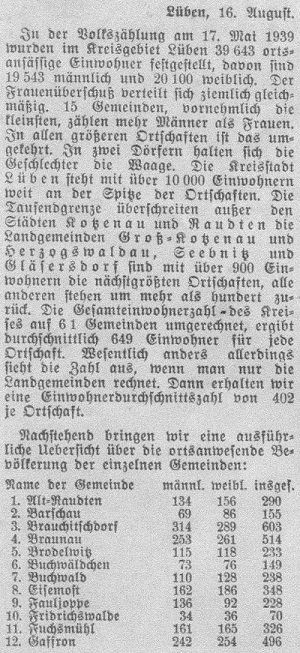 Mit einem herzlichen Dank an Walter Lehmann für den Ausschnitt aus der Niederschlesischen Tageszeitung mit Ergebnissen der Volkszählung in den Gemeinden des Kreises Lüben vom Mai 1939:
