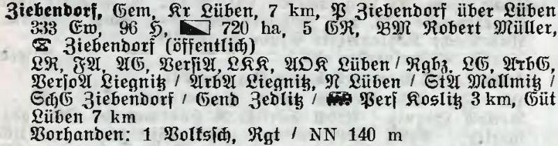 Gemeinde, Kreis Lüben, 7 km, Post Ziebendorf über Lüben, 333 Einwohner, 96 Häuser, Flurgröße 720 ha, 5 Gemeinderäte, Bürgermeister Robert Müller, Fernsprecher Ziebendorf (öffentlich), Landratsamt, Finanzamt, Amtsgericht, Versicherungs-amt, Landkrankenkasse, AOK Lüben / Regierungsbezirk, Landgericht, Arbeitsgericht, Versorgungsamt Liegnitz / Arbeitsamt Liegnitz, Nebenstelle Lüben / Standesamt Mallmitz / Schulgemeinde Ziebendorf / Gendarmeriebezirk Zedlitz / nächster Personenbahnhof Koslitz 3 km, Güterbahnhof Lüben 7 km. Vorhanden: 1 Volksschule, Rittergut / NN 140 m