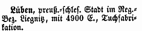 Lüben, Kreisstadt im preußischen Regierungs-Bezirk Liegnitz, am Kalten Bach, (1905) 6568 Einwohner, Amtsgericht; Tuchfabrikation. |